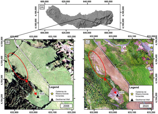 Location of the study area highlighting the surrounding area of the RG4 well (signed as a black triangle). (A) São Miguel DEM; (B) orthophoto map of the RG4 surrounding area in 2006, before the thermal anomaly; and (C) UAV RGB image after the thermal anomaly, 2020 (Source: CIVISA). The red line corresponds to the area with the highest concentration of anomalies and visible alteration of vegetation.