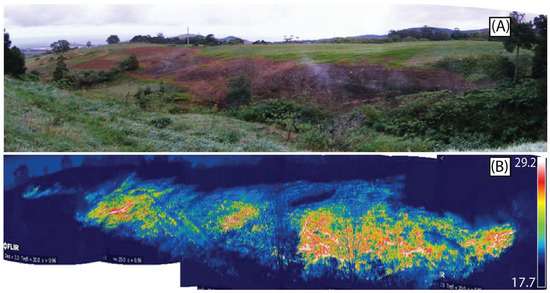 Several studies have applied RS techniques to study high temperature (>100 °C) fumarolic fields (e.g., [16,17,18]); however, the identification of hydrothermal (<100 °C) fumaroles has been challenging [19]. Nevertheless, a few studies have already shown the use of satellite data to recognize anomalous thermal zones in hydrothermal systems, such as the studies carried out at the Nisyros (Greece) [20] and Solfatara (Italy) [21] volcanoes. Changes in the hydrothermal system of the Yellowstone Volcano (USA) were detected through thermal images in 2007; however, visible spectrum images allowed for the first signs of change in vegetation to be identified in 2001 [22] using high-resolution images. This case highlights the relevance of associating thermal and visible data for monitoring remote areas.