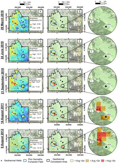 Part of the Geothermal Concession Area: (A) the ASTER nighttime thermal infrared image from 29 March 2010, (B) normal temperatures (below average temperature + 2σ) presented in green, above average temperatures + 2σ in orange, and above average + 3σ in red, and (C) framing of the area near the RG4 well, where it was not possible to identify thermal anomalies; (D) the ASTER nighttime thermal infrared image from 24 June 2010, (E) normal temperatures presented in green, above average temperatures + 2σ in orange, and above average + 3σ in red, and (F) framing of the area near the RG4 well, where it was not possible to identify thermal anomalies; (G) the ASTER nighttime thermal infrared image from 21 September 2010, (H) normal temperatures presented in green, above average temperatures + 2σ in orange, and above average + 3σ in red, and (I) framing of the area near the RG4 well, where it was not possible to identify thermal anomalies; (J) the ASTER nighttime thermal infrared image from 14 August 2011, (K) normal temperatures presented in green, above average temperatures + 2σ in orange, and above average + 3σ in red, and (L) framing of the area near the RG4 well, where it was possible to identify thermal anomalies; (M) the ASTER nighttime thermal infrared image from 09 August 2012, (N) normal temperatures presented in green, above average temperatures + 2σ in orange, and above average + 3σ in red, and (O) framing of the area near the RG4 well, where it was possible to identify thermal anomalies.
