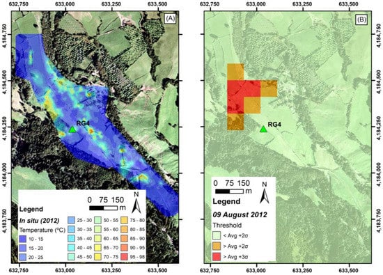 Despite the seven months between the measurements performed in the field and the ASTER imaging, it is important to highlight that the degassing and thermal anomalies that developed in the field after May 2010 have been quite stable since early 2012 [41]. Nevertheless, as observed in Figure 5A, some of the anomalous thermal zones are smaller than the anomaly that developed in the northwestern area of RG4. This area was mostly detected with the ASTER data (Figure 5B). As mentioned, there are areas mapped in the thermal anomaly map resulting from the field measurements that do not appear in the ASTER image. Some differences could eventually explain this as being due to the interval between the date of the field measurement and the satellite image. However, measurements carried out in 2016 [41] still show the same general spatial distribution of anomalous thermal areas. The most probable explanation relates to the influence of the sub-pixel area [44] since the areas identified by the ASTER correspond to the more extensive in situ degassing area, as shown in Figure 5.