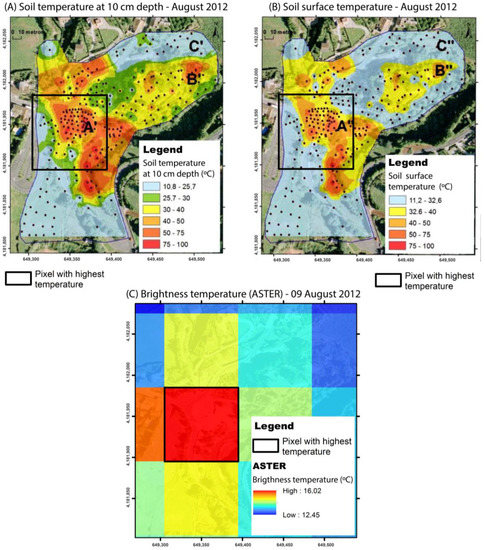 Comparison between temperature (A) in the soil at a depth of 10 cm (Pacheco, 2013), (B) on the ground surface in situ (Pacheco, 2013), and (C) measured using the ASTER sensor in the area comprising the Furnas hydrothermal fumaroles.
