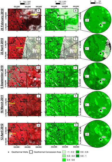 Part of the northern flank of Fogo Volcano: the ASTER RGB composite image (bands 3, 2, 1), the NDVI map of the study area, and framing of the NDVI map near the RG4 well, respectively, for the following dates: 25 February 2010 (A,B,C); 23 April 2010 (D,E,F); 5 September 2010 (G,H,I); 16 March 2011 (J,K,L); 12 April 2012 (M,N,O).