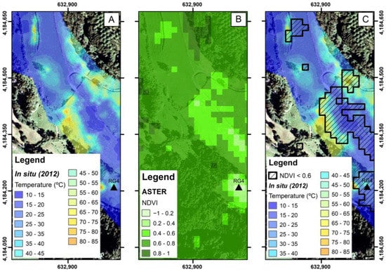 Overlay of the lowest NDVI map values (April 2012) with the respective in situ soil temperatures map (January 2012). (A) In situ soil temperature; (B) the ASTER NDVI values; and (C) a comparison of the soil temperature and lowest values of the NDVI.