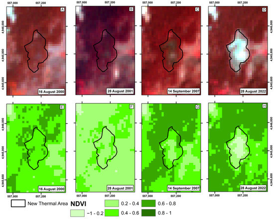 Yellowstone new thermal anomaly near Tern Lake: the ASTER RGB composite image (bands 3, 2, 1) and the NDVI map, respectively, for the following dates: 16 August 2000 (A,E); 28 August 2001 (B,F); 14 September 2007 (C,G); 28 August 2022 (D,H). The black line corresponds to the new thermal anomaly area.