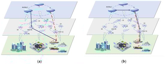 As shown in Figure 1a, when airship 3 communicates with ship 1, the link indicated by the dashed line is selected to complete the communication. When airship 1 also receives the task of communicating with ship 1, due to the independence of the tasks, it chooses the link represented by the solid line to communicate. This not only causes a waste of network resources but also makes the links between nodes repeatedly disconnected, causing a network server instability. If the routing path of airship 1 can be shown as the solid line linked in Figure 1b according to the similarity of the tasks, this problem will be solved.