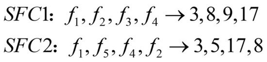 Service request definition: We treated the service request as a directed acyclic graph, assuming that a batch of requests is processed with an interval T . Of course, these requests may arrive at any time during the last processing interval. This study focused on batch processing within the time interval T . Service request R is represented by tuples R = < F , E > , where R = { r | r = 1 , 2 , , | R | } represents the service request that arrives within time T . The source and destination nodes of each service request are represented by { s r | r R } and { d r | r R } , respectively. The node of the service request is the VNF, and the link is the dependency among the VNFs. There are k types of VNFs required by the service, including bandwidth requirements { B r | r R } , computing power requirements { C r | C r > 0 . r R } and the delay deadline { D r | r R } . Each service request r consists of a set of VNFs { f 1 , f 2 f i | i F } , and the link E r = { ( p , q ) | p , q F , r R } between the VNFs needs to follow the dependencies between virtual network functions.