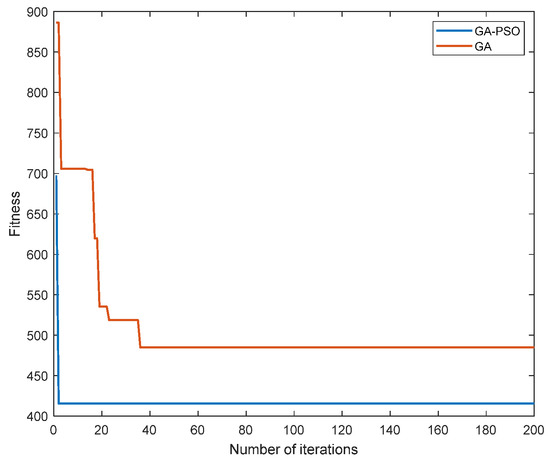It can be seen from Figure 4 that the GA-PSO algorithm proposed in this study was superior to the GA algorithm in terms of the convergence speed and fitness value.