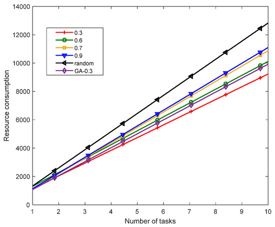 Figure 8 shows the resource consumption comparison of the single-chain deployment method proposed in this study with the different similarity thresholds, the GA algorithm with a similarity threshold of 0.3 and the randomly deployed RANDOM algorithm with different numbers of tasks. When the similarity threshold was 0.3, the resource consumption of the GA algorithm was higher than that of GA-PSO under the same number of tasks. When the same aggregation method was used, the GA-PSO algorithm had better optimization performance and convergence. It can be seen from the figure that as the similarity threshold gradually increased, resource consumption also increased. When the task similarity threshold gradually increased, the number of aggregated VNFs continued to decrease. As a result, more and more VNFs needed to be instantiated. The increase in instantiation overhead led to an increase in resource consumption. The RANDOM algorithm had the highest resource consumption due to its deployment without any optimization strategy.