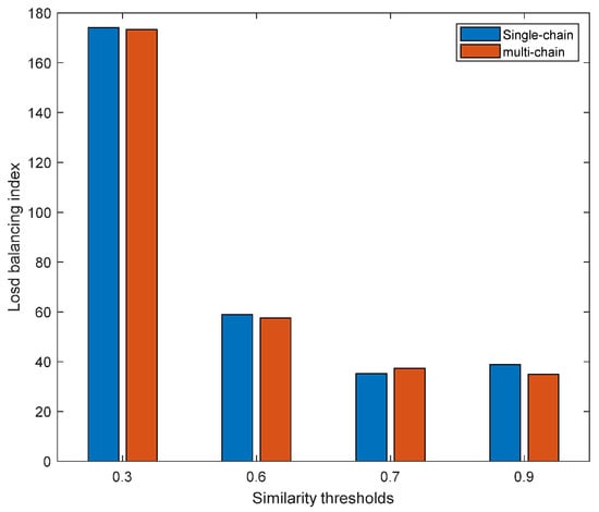 Figure 9. Comparison of the single-chain and multi-chain load-balancing indexes with different similarity thresholds.