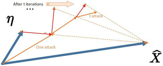 As shown in Figure 1, with the blue arrow and after confirming the effective attack sample , a new attack sample is created. The candidate disturbance is obtained after t secondary iterations.