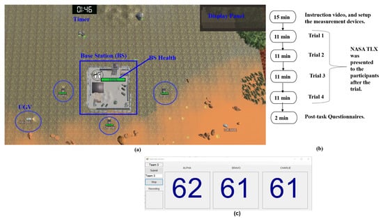 The study received approval as low-risk research from the Human Research Ethics Advisory Group of the Faculty of Science and Technology at Deakin University in Australia. After participants signed the written informed consent, they wore the Polar H10 chest strap on their upper rib cage (following the H10 wearing guidelines [21]). Triads were randomly seated in front of the computers with new identifications assigned as Alpha, Bravo, and Charlie. Subsequently, participants watched a video explaining the rules and objectives of the task. Following the instruction video, participants completed a 1 min practice trial. These procedures were aimed at getting the teams familiarised with the task. The experimental task consisted of four trials with each trial lasting 11 min; Figure 1b shows the estimated time of the total experiment. Participants completed NASA-TLX questionnaires at the end of each trial and the post-experiment cooperation questionnaires at the end of the simulated task [18].