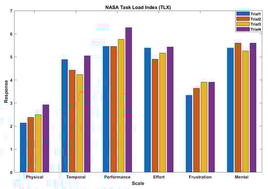 After each trial, the NASA-TLX questionnaire was presented to each team member, where they provided feedback on perceived levels of physical demand, mental demand, temporal demand, performance, effort, and frustration. Participants responded to NASA-TLX questions on a scale of 0–10 such that scores of 0 and 10 represented the minimum and the maximum load index, respectively.