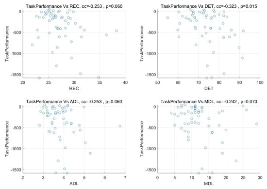 A Pearson correlation analysis using SPSS software was implemented to see the relationship between task performance and physiological synchrony calculated using MdRQA and CC measures among the three team members. In the Table 1, MdRQA recurrence measures such as DET and MDL were significantly correlated with task performance using mRR and SDNN features, while the rMSSD feature did not show any significant correlation with task performance (see the scatter plot in Figure 5 for MdRQA measures using mRR feature).