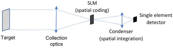 Figure 1 shows a simplified block diagram illustrating the working principle of a CS instrument: the scene of interest (target) is collected by a suitable optics and focused on the image plane field stop at the SLM plane. This device performs the scalar product by applying a spatial binary coding mask to the image. This coding is obtained by setting the SLM elements in a specific configuration of on/off states. If the device used as SLM is a DMD, this means that each of the DMD micromirrors is set either in an “on” or an “off” state, providing an on–off masking of the scene. The whole coded image is collected by a condenser and fed to the detector for signal acquisition: the latter step corresponds to performing a spatial integration of the coded image and subsequent acquisition. The iteration of this procedure allows the collection of a series of spatially integrated measurements of the same scene, each measurement corresponding to the scene coded by a different mask. The use of a suitable basis of coding masks allows the reconstruction of the image. The acquisition and use of a limited number K of measurements—with K being far less than the number N of pixels of the reconstructed image—allows the reconstruction of the original image in a sparse domain, i.e., the reconstruction of an intrinsically at-sampling-time-compressed image by using ad hoc algorithms.