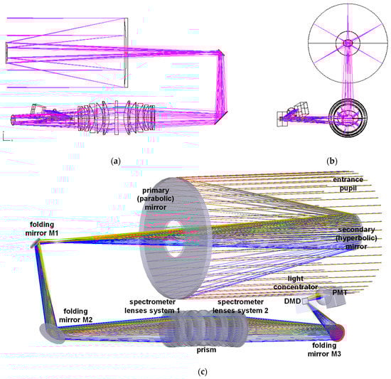 The mechanical arrangement of an elegant breadboard of the proposed instrument is shown in Figure 14. The mechanical arrangement is organized in two levels: the collection optics are placed in the upper part of the optical breadboard, while the spectrometer with the DMD, the detection unit, and the electronics are placed in the lower part.