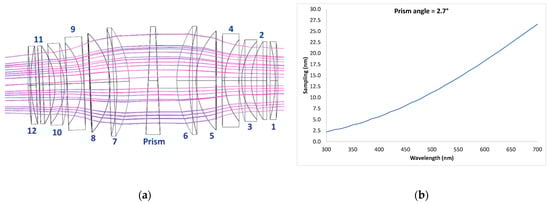 The optical system and the prism were designed in order to reach the best optical performance in terms of modulation transfer function (MTF) and point spread function (PSF) on the DMD image plane. At the same time, the optical materials were also selected in order to improve the transmittance in the UV–Vis spectral range, also taking into account their compatibility for their use in space environment. The optical performances on the DMD image plane were improved by finding the focal length of the spectrometer and angle of dispersion of a single prism ad hoc. Additionally, due to the optical characteristics of glasses (low transmittance) in the 250 nm–300 nm range, the operational spectral range of the system was set to 300 nm–650 nm. The spectrometer is a symmetric system of lenses with 723.5 mm effective focal length (BFL494.5 mm). The design relies on a 2.7° triangular-base prism in silica glass in order to provide superspectral resolution, spreading the 300–650 um band on 50 pixels. The materials were selected in order to minimize the aberrations of the entire system and to improve the optical transmittance in the UV. Figure 4 shows the layout of the spectrometer together with the spectral sampling curve from 300 nm to 700 nm.