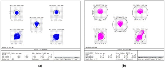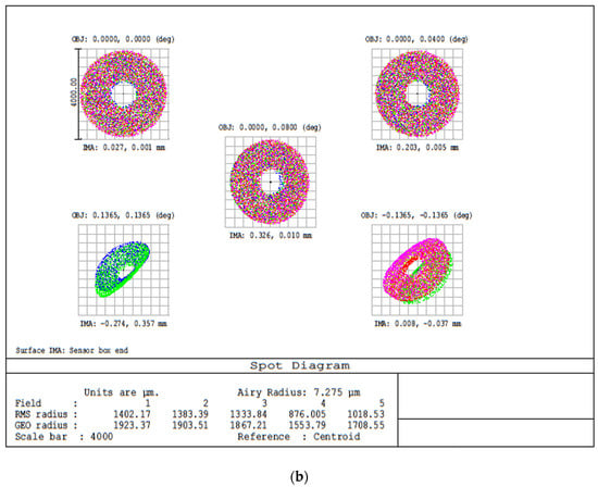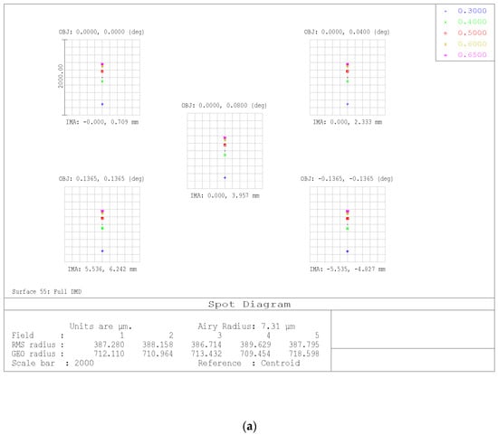 Spot diagram on the image plane (DMD surface) for different angles in the instrument field of view: (a) spot diagram at 300 nm, and (b) spot diagram at 650 nm.
