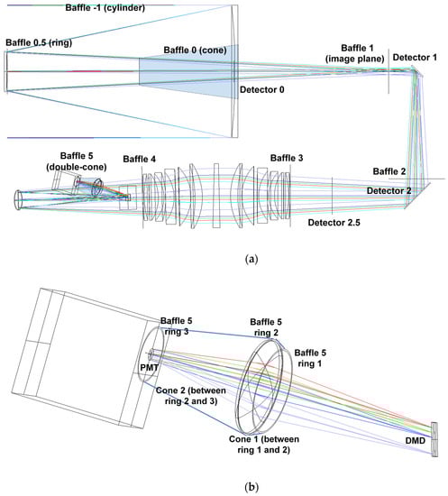 Stray light analysis: (a) positions of the baffles and detectors and (b) detail of the position and size of Baffle #5.