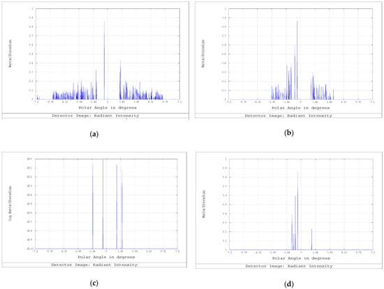 First-order stray light analysis: angular cross sections on the detectors. (a) stray light at Detector #0 (after exit pupil, on primary mirror). (b) Detector #1 (on the image plane). (c) Detector #2 (between the two folding mirrors), (d) Detector #2.5 (before the spectrometer).