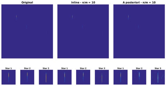 Figure 10, Figure 11 and Figure 12 show the comparison between the original image, the reconstructed image with inline MTF compensation, and the reconstructed image with a posteriori compensation of the MTF after the image reconstruction, respectively. Inline MTF compensation refers to the MTF being approximately inverted directly during the CS reconstruction process, where the sensing matrix Φ is the product of an actual sensing matrix and of a degradation kernel describing the point spread function; a posteriori compensation refers to the MTF inversion being applied to the reconstructed data. We showed that having side information available about the position of the star spectra in the image significantly improves reconstruction quality, as it allows compensating the MTF affecting the significant image components, i.e., the star spectra, as can be noticed in Figure 10, Figure 11 and Figure 12.