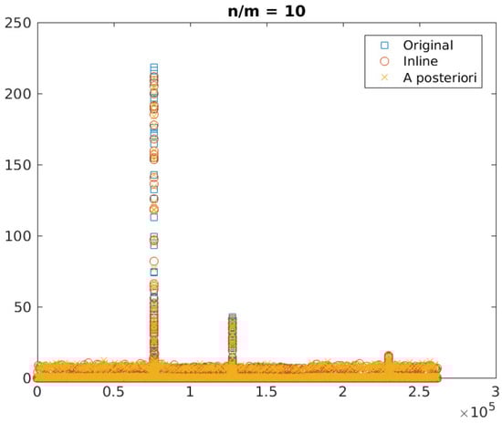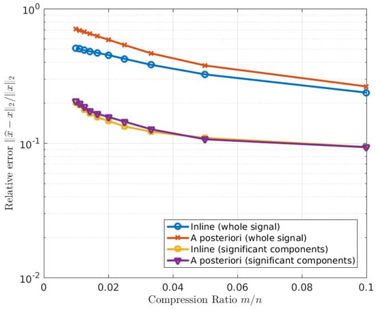 CS is a novel data acquisition technique that leverages the feature of many natural signals of being highly correlated. A high correlation entails the existence of a domain (integral transform) in which the signal is sparse and only a small fraction of the transform coefficients is significantly different from zero [1,2,3]. CS theory affirms that an exactly sparse signal can be sensed with a small number of linear measurements without any information loss [4]. As a consequence, the number of samples foreseen using the Nyquist–Shannon sampling theorem for the reconstruction of a generic signal could, in the appropriate transformed domain, be reduced without any loss of information. If the signal is only approximately sparse, then the reconstruction is approximate. The signal could then, in principle, be reconstructed by acquiring only few measurements, hence the term CS, meaning that the signal is compressed at the acquisition stage.