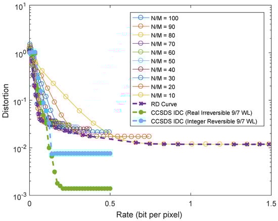 Finally, we performed a rate–distortion analysis of the CS system and compared it to the powerful compression algorithm in the CCSDS-IDC recommendation. The rate–distortion curve for the CS system is represented by the magenta curve in Figure 13, which corresponds to the envelope of all achievable operating points. While in principle, adaptive data compression as in the IDC recommendation is expected to outperform a universal compression method such as CS, it can be seen that there are regions corresponding to strong compression in which CS outperforms the IDC standard.