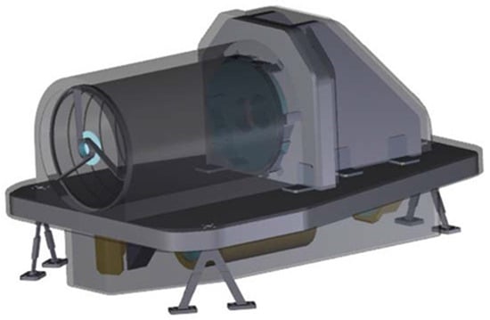 A Cassegrain-type reflector telescope ((Figure 3a) is used as the collection optics. We chose this type for its capability of minimizing the field curvature. An almost-flat image is needed for applying the masking to the image on the DMD plane. Refractor elements are not used in the telescope, being a mere reflector telescope made of a primary parabolic mirror and a secondary hyperbolic mirror. The focus is beyond the primary surface. The two mirrors are mounted in line with respect to the optical axis: the primary mirror has a circular aperture corresponding to the zone obscured by the secondary mirror (Figure 3b).