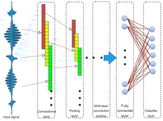 The convolutional neural network (CNN) is a special type of deep neural network. In 1984, Fukushima et al. proposed the concept of a neurocognitive machine based on the perceptual domain, which is regarded as the beginning of the formal appearance of the convolutional neural network [28]. The 1D convolutional neural network mainly consists of a 1D convolutional layer, a 1D pooling layer, a fully connected layer, and a classifier, as shown in Figure 1.