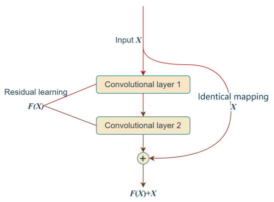 The deeper the structure of the convolutional neural network, the higher the degree of expression and the better the fitting ability of the network. However, as the number of network layers increases, problems such as gradient explosion and gradient dispersion inevitably arise. In 2015, He et al. proposed a deep residual network model (ResNet), the essence of which is to introduce a residual module using a jump-connected network structure to superimpose shallow and deep features [22]. This effectively avoids the loss of shallow features during network training and solves the phenomenon that the network performance of the deep convolutional neural network decreases as the number of layers increases. The residual module is defined as follows: