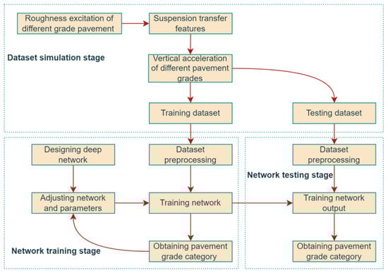 A pavement roughness recognition algorithm can be constructed using the abovementioned deep network to capture strong features from vehicle acceleration responses. Its primary process is shown in Figure 4, which is divided into the network training and testing phases.