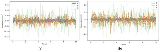 Simulation experiments were conducted using the 1/4 vehicle vibration model and the random pavement model to generate the vehicle vibration response under different pavement roughness grades. The pavement roughness simulation experiments were conducted under six pavement grades: A, B, C, D, E, and F. The simulation was with a vehicle speed of 3 m/s, a simulation time of 10 s, and a sampling frequency of 100 Hz (Table 2), and the vehicle response signals were obtained under all pavement grades (Figure 6). The constructed vehicle vibration response dataset contained 1800 samples and 300 samples for each pavement category. Then, the dataset was randomly divided into two groups: 70% for model training and 30% for model testing.