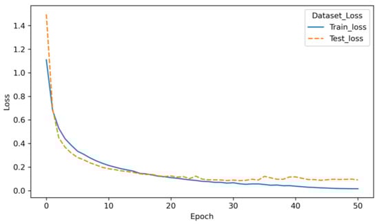 The experimental environment included the Python language and PyTorch deep learning framework, along with the hardware environment of an Intel(R) Core(TM) i7-10710U CPU processor. Before conducting the experiments, the simulation dataset was normalized in order to improve the convergence speed and recognition accuracy of the pavement grade classifier. In this experiment, the Adam optimization algorithm and cross-entropy loss function were used to train the model and optimize the model fitting effect. After setting the initial parameters, the acceleration vibration signals with the corresponding pavement roughness category labels were input into the network to start the training. In the training processing, the hyperparameters (number of iterations set to 50, learning rate set to 0.001) were adjusted to achieve a high classification accuracy.