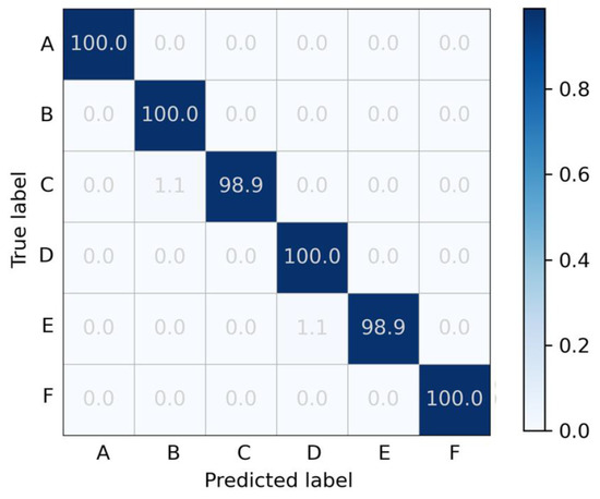To further analyze the effectiveness of the 1D-RCNN model for classifying different types of pavements, the confusion matrix of the model for classifying six types of pavements was drawn, and the results are shown in Figure 8. The confusion matrix analysis shows that the trained network has a high accuracy rate for each type of pavement dataset. In the vast majority of cases, the predicted category is consistent with the actual category. The few incorrectly predicted pavement roughness classes are within ±1 of the actual class, with an error rate of no more than 3.3%.