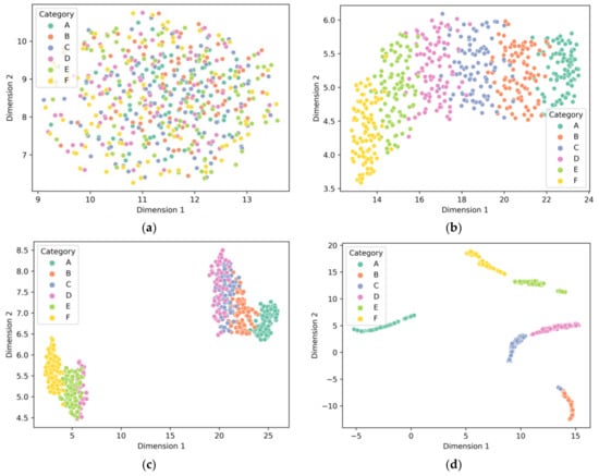 The 1D-RCNN layer output’s UMAP downscaling visualization: (a) first convolutional layer, (b) second convolutional layer, (c) third convolutional layer, (d) fully connected layer.