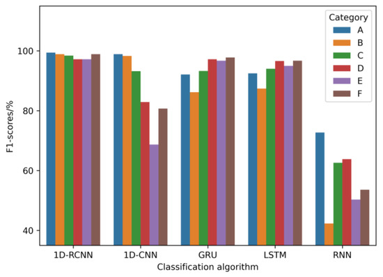 In order to validate the proposed method, five typical models in sequence data classification were studied, and the one-dimensional convolutional network (1D-CNN), GRU (gated recurrent unit), long short-term memory (LSTM) network, and recurrent neural network (RNN) were used as the comparison models. The accuracy, precision, recall, and F1-score on the same test set were used as evaluation indices to analyze the above five models, and the comparison results are shown in Table 4. From the F1-score of each type of model, a more intuitive F1-score bar plot can be drawn, as shown in Figure 10.