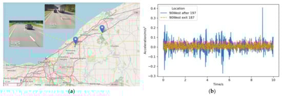 In order to further validate the practical application based on the 1D-RCNN deep learning algorithm in pavement roughness grade recognition, a road section of the I90 highway in Cleveland, Ohio, in 2005 was used as the test object. Two test locations with different roughness grades were selected for testing, where the pavement roughness grade at location 1 (90West after 197) was D, and the pavement roughness grade at location 2 (90West exit 187) was B (see Figure 11a). For this study, the vertical acceleration was measured by an ICP (integrated-circuit piezoelectric) accelerometer. The acceleration signal can be displayed in real time on a laptop. Vertical acceleration measurement system details can be found in [33]. The acceleration acquisition system acquired the acceleration vibration signals at positions 1 and 2, as shown in Figure 11b.