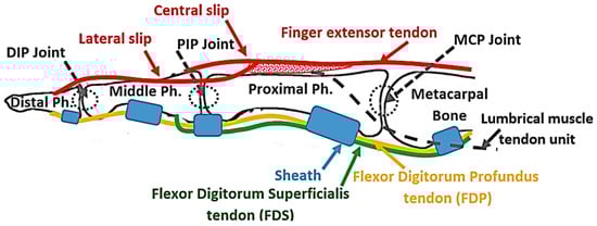 Finger flexion is achieved by the action of the flexor digitorum superficialis (FDS) and the FDP extrinsic muscles. The FDS tendon, attached to the middle phalanx, flexes the PIP joint, while the FDP tendon is attached to the distal phalanx and flexes the DIP joint. When the PIP joint flexes, the lateral slip of the EDC tendon loosens up and allows the DIP joint to flex. The structure of the EDC tendon limits the DIP joint range of motion, which spans from full extension to a maximum permissible flexion angle, which increases for the higher PIP angle [25] as determined by the PIP–DIP interdependence relation [26]. Finally, the MCP joint is indirectly flexed under the effects of the forces transmitted by the FDP and FDS tendons that are attached further along the kinetic chain of the finger, specifically at the ventral side of the distal and middle phalanges. The torques generated by these two tendons are transmitted between the segments of the chain until they reach the MCP joint where their effect is combined. The sheaths (Figure 1), which are responsible to keep the tendons close to the phalanges, convert the linear force in the tendons to torque at the joins.