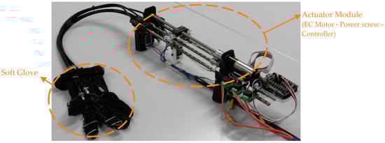 The implemented prototype. A power screw was used to transfer the power from the EC-motor to the flexion and extension mechanisms implemented on the soft glove.