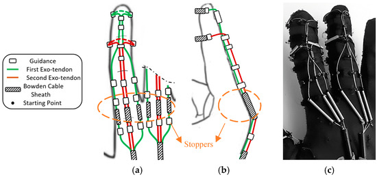 The proposed extension mechanism, (a) Top view (dorsal side) and (b) Side view, including the exotendons paths, the positions of the guidance, the starting point, the Bowden cable sheaths, and the stoppers for preventing hyperextension of the MCP joint. (c) The soft glove with the mechanism implemented (dorsal side).