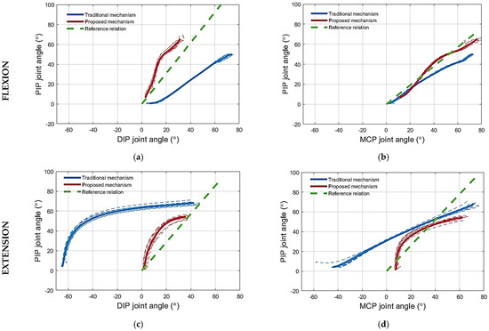 The phase plots for the finger joint angles during flexion and extension of the artificial finger using novel mechanism and traditional solution: (a) PIP–DIP joint angle relation during flexion; (b) PIP–MCP joint angle relation during flexion; (c) PIP–DIP joint angle relation during extension; (d) PIP–MCP joint angle relation during extension. Stippled lines are individual trials, and thick lines are the averages for the proposed (red) and traditional mechanism (blue). The dashed green lines are the reference inter-joint relations taken from the literature [29,39].