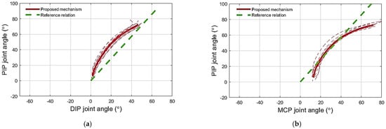 (a) PIP–DIP joint angle relation obtained when extending the stiff artificial finger, simulating spasticity, using the proposed extension mechanism. (b) PIP–MCP joint angle relation obtained when extending the stiff artificial finger, simulating spasticity, using the proposed extension mechanism. The PIP–DIP and PIP–MCP reference relations reported in the literature [29,39] for the human finger are shown as green dashed lines.