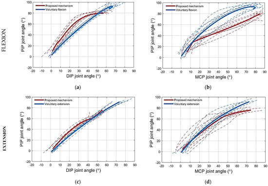 The phase plots for the finger joint angles during flexion and extension for the middle finger of healthy subjects using the novel mechanism: (a) PIP–DIP joint angle relation during flexion; (b) PIP–MCP joint angle relation during flexion; (c) PIP–DIP joint angle relation during extension; (d) PIP–MCP joint angle relation during extension. Thick lines are the averages for the proposed mechanism (red) and the voluntary motion (blue).
