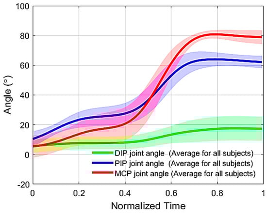 DIP, PIP, and MCP joint flexion trajectories for the middle finger of healthy subjects flexed using the proposed mechanism after blocking the DIP joint with a finger splint. The thick lines are the means, and the shaded areas represent the standard deviation.