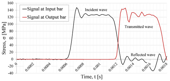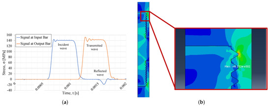 In Figure 7a, the input, output, and reflected waves from the axisymmetric model are plotted. Comparing the results from both types of numerical simulations, it can be noticed that the maximum stress wave values from both simulations are identical, yielding, in both cases, an amplitude of approximately 140 MPa.