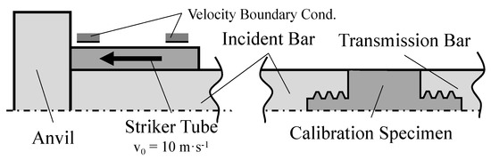 The axisymmetric numerical model was developed with the initial and boundary conditions as the three-dimensional numerical model, and all components were also defined as being of X 90 CrMoV 18 stainless steel, whose properties are detailed in Section 3. Contact-to-contact was defined in the contacting interface between the anvil and the striker tube, as well as in the interfaces between each bar and the calibration specimen. These contact-to-contact surfaces have a friction coefficient of 0.3.
