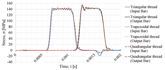 In Figure 8, the resultant incident and transmitted waves are plotted, which were obtained from simulations where the calibration specimen has a triangular, trapezoidal, or quadrangular thread shape, and a striker speed of 10 m/s.