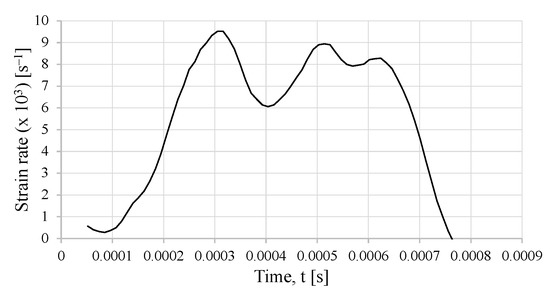 where is the length of the specimen, is the reflected strain, and is the wave propagation speed in the bar’s material. One must point out that, for the case of an SLJ specimen, the length of the specimen is replaced by the thickness of the adhesive layer, which is 0.2 mm. This is carried out since an SLJ is a multi-material specimen and the strain rate is altered in a significant manner just by considering the material properties of the epoxy adhesive (in essence, a polymeric material) or the properties of the stainless steel alloy. Therefore, the presented strain rate in Figure 19 is considerably overestimated if one uses the theoretical calculation of the strain rate, as presented in Equation (6). Furthermore, this effect is compounded by the fact that the strain rate is calculated with the measured strain from the reflected wave.