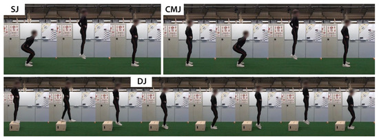 The procedure of the experiment was explained to the participants, and their consent was obtained before recording. Demographic and anthropometric data of the subjects, such as age, gender, weight, height, were collected, as well as physically active time and previous musculoskeletal injuries in the last two years. The subjects performed different jumping tasks five times each, containing Squad Jumps (SJ), Countermovement Jumps (CMJ), and Drop Jumps (DJ). The exact execution of the exercises is shown in Figure 1. Attention should be paid to not cushioning the landing by strong knee flexion for all exercises but to keep the legs as extended as possible in order to achieve as high as possible the impact on the bones [26]. The first landing/ground contact when executing the DJ is followed by a bounce hop. The second landing follows the instruction of the SJ and CMJ. In contrast to the SJ and CMJ, the jump height for the DJ is mainly achieved by reflex plantar flexion of the ankle joint with the knee angle as extended as possible.