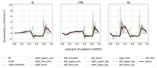 The graphs of the acceleration in gravitational direction show very similar curves for all sensors. Positive accelerations in the graphs spatially mean a movement upwards (jump) or the deceleration of the movement at the landing. Clear outliers can only be observed for the accelerations of the foot sensors. The peak accelerations here are partly two times that of the remaining sensors. For the DJ, however, the differences are smaller. In order to illustrate what has been described, the graphs of the accelerations for one randomly selected person are shown in Figure 2.