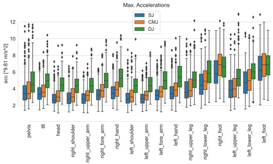 The maximum accelerations at the different sensor positions indicate that the impact of the jumping exercises can be measured with an acceptable accuracy on almost all parts of the body. When these results are compared with previous studies, the mean values tend to be lower in the present study. This can be attributed to the lower sampling rate, which has the disadvantage that very short acceleration peaks may not be detected. Vainionpää et al. (2006) used an IMU with a sampling rate of 400 Hz [19]. The acceleration data in this study was acquired at a frequency of 60 Hz. This sampling rate was chosen to compare with typical values of wearables [28,29,30]. The maximum accelerations are still in the same areas, thus, these peaks were sufficiently captured.